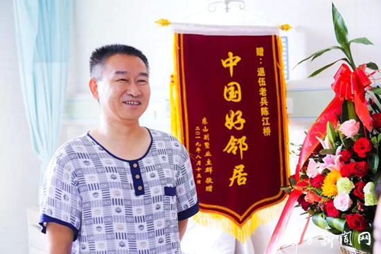 2019年7月29日,我市发生一起恶性抢劫伤人案件,一名歹徒手持匕首冲入位于东山别墅住宅区的受害者家中实施抢劫。危急时刻,邻居陈江桥挺身而出,与歹徒展开激烈搏斗,保全受害者免受伤害。在此过程中,陈江桥脖颈、背部等处被手持利刃的歹徒刺伤,最长伤口超过25公分,失血1000多CC,所幸未伤及要害,经抢救脱离生命危险。