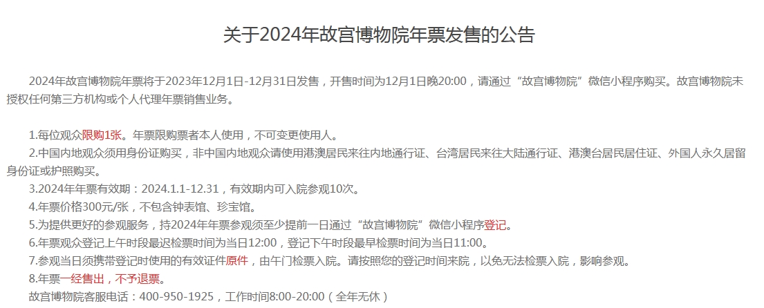 据悉,2024年年票有效期为2024年1月1日至12月31日,有效期内可入院参观10次,每位观众限购1张,年票价格300元,不包含钟表馆、珍宝馆。