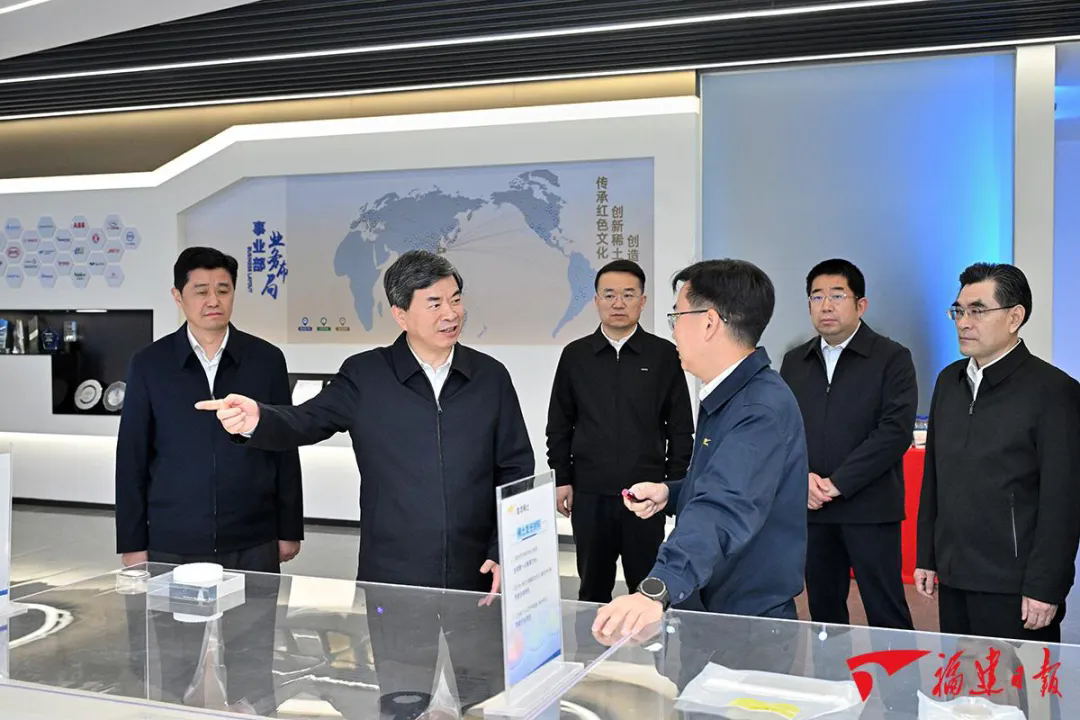 红土地蕴藏着“金色”物产矿藏。依托当地丰富的稀土资源,龙岩发挥与厦门山海协作的优势,因地制宜积极推动稀土产业高质量发展。在长汀县金龙稀土股份有限公司,周祖翼认真听取稀土战略资源保护开发及企业改革、技术攻关、产品研发等情况,走进车间察看4000吨高性能稀土永磁材料项目生产工艺。周祖翼强调,要坚持可持续发展,加强环境保护,实现清洁生产、安全生产,走生态优先、绿色低碳发展之路。要加大人才培育引进,加强与高校、科研机构产学研合作,推动科技创新和产业创新深度融合。要深化上下游企业对接合作,延伸产业链条,提高产品附加值,构建更加完善的稀土产业链生态体系,大力塑造产业发展新优势。