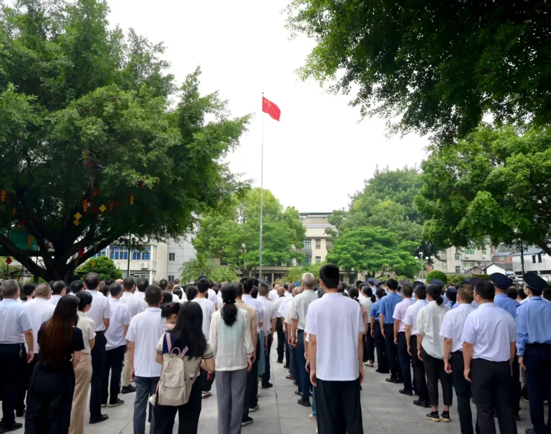 上午8时许,护卫队队员将国旗郑重护送至升旗台,在《义勇军进行曲》的庄严旋律中,鲜艳的五星红旗迎风升起。现场全体人员肃立,齐声高唱国歌,以注目礼致敬国旗,共同祝愿伟大祖国繁荣昌盛、国泰民安。