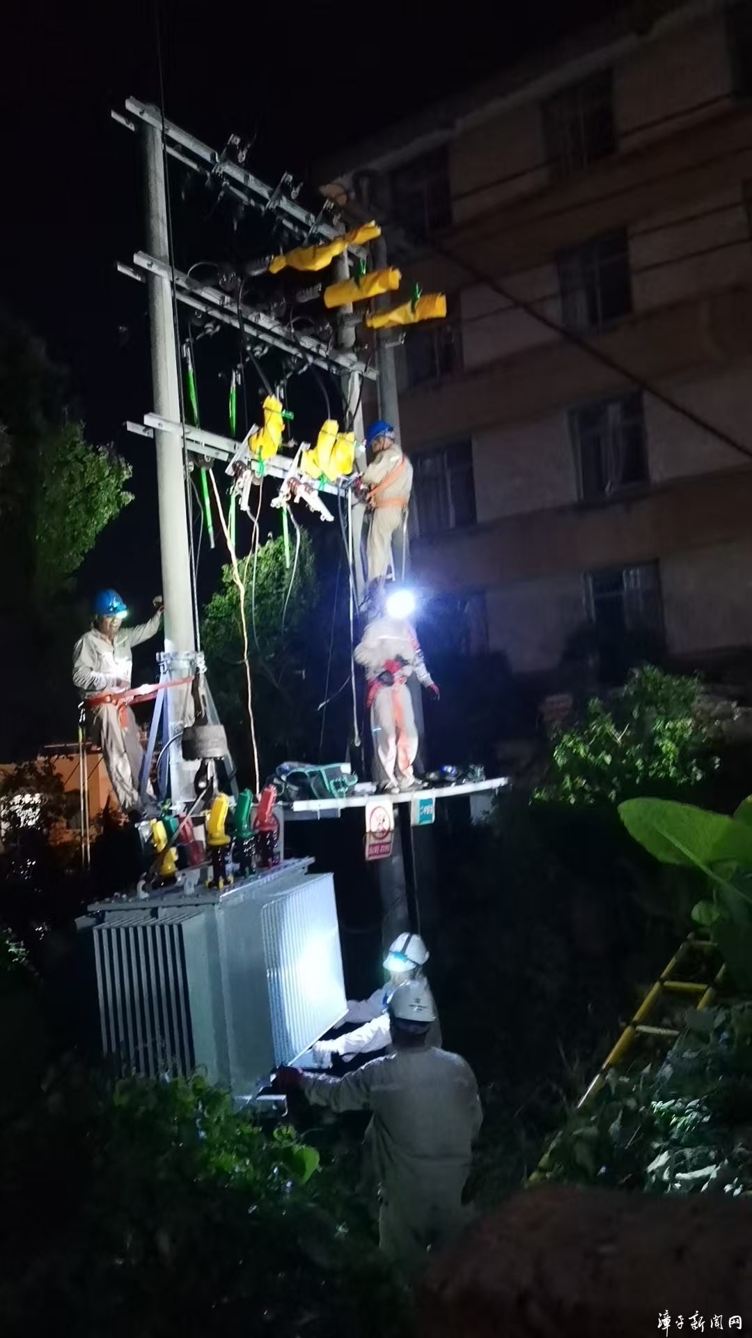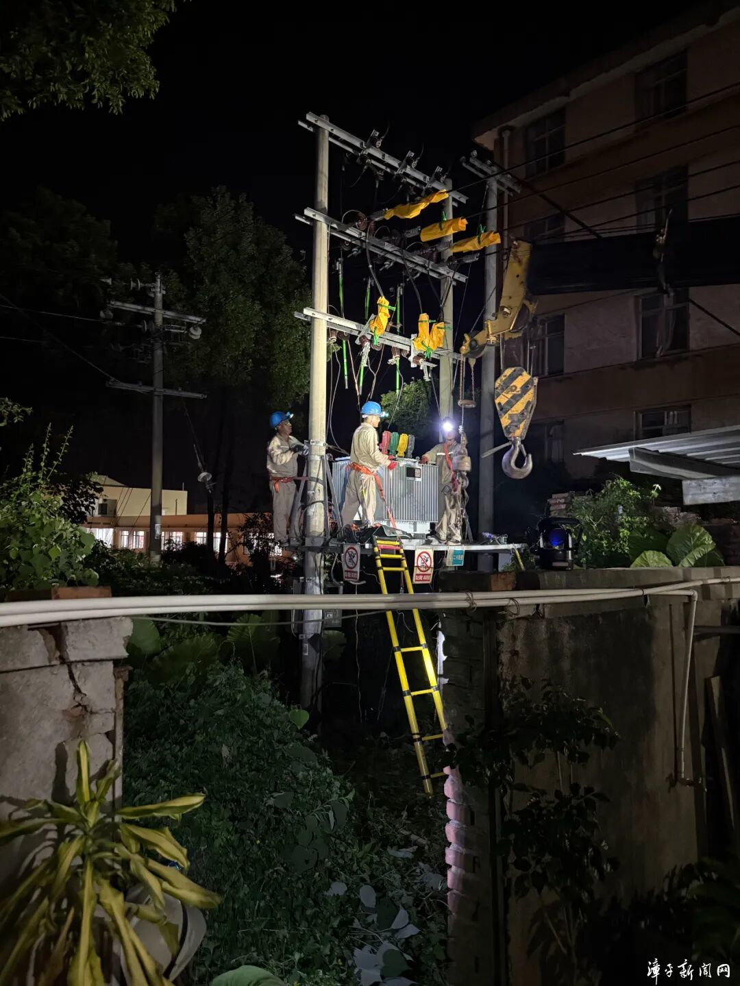 进入秋冬季,天暗的比较早,夜间作业视线不佳,可现场抢修人员们依靠丰富经验与专业技能,克服诸多困难,历经数小时紧张有序施工,21点40分,一台新的630千伏安变压器被缓慢地吊到指定位置,代替了之前的漏油旧变压器。