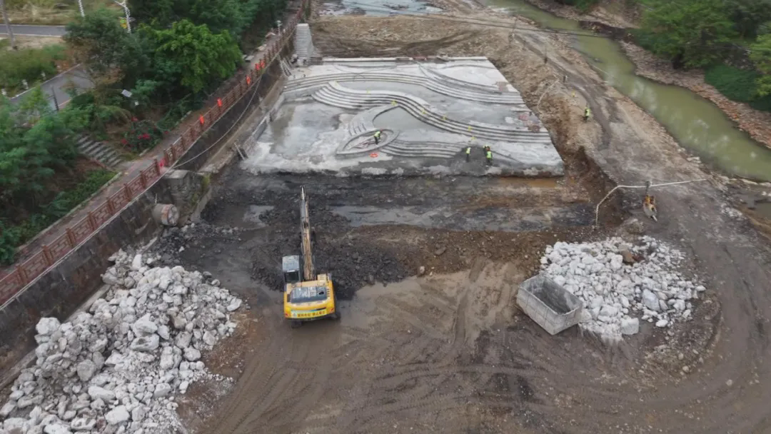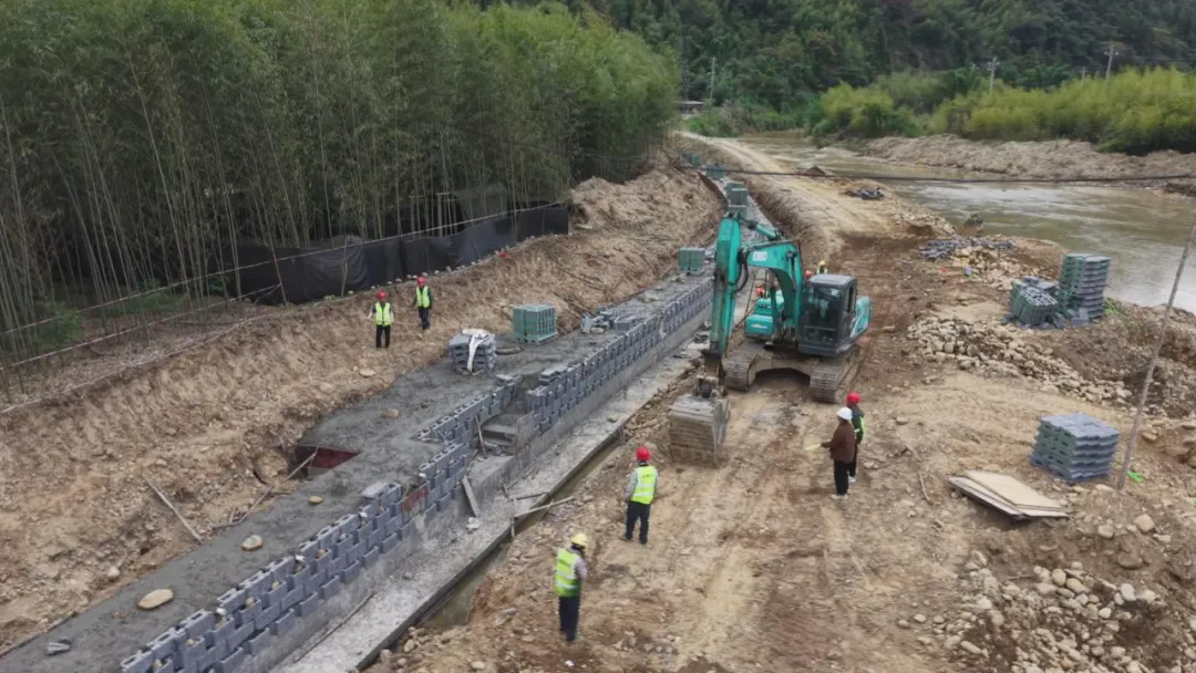 近日,记者走进九鹏溪幸福河湖建设项目双洋镇员当段施工现场,只见大型机械往来穿梭,工人们正专注开展岸线植被恢复与生态护岸施工,一派热火朝天的建设景象。