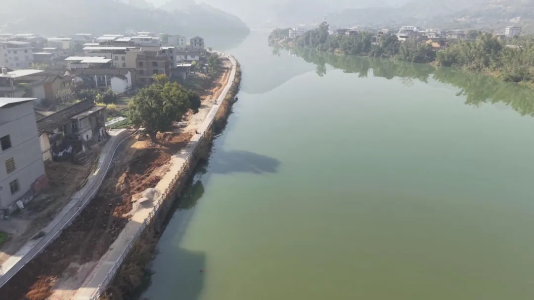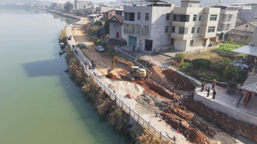 本工程施工完成量差不多20%,我们现在正在施工的是内河到丁坂尾,目前挡墙已完成1400方,沿河道路污水管网施工进度完成60%,路床已完成50%,预计春节前沿河道路完成硬化,整个工程预计在今年上半年完成。