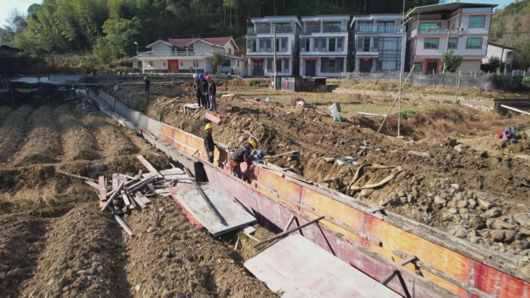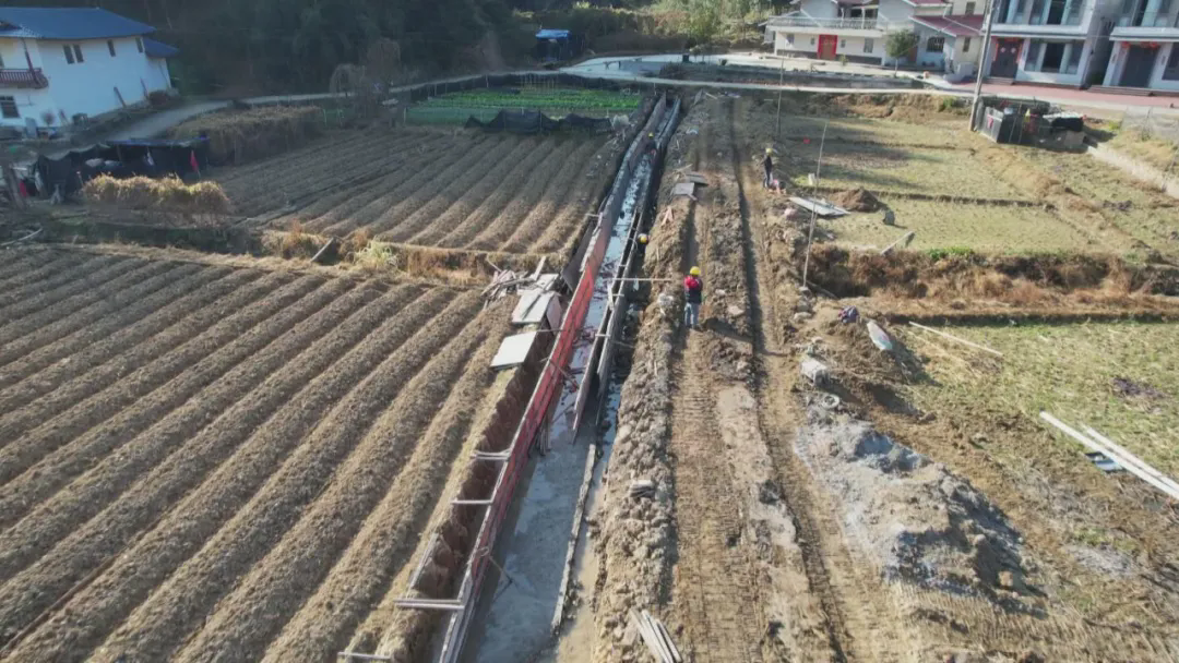 近日,在漳平市新桥镇陈坑村、产坑村的高标准农田建设现场,挖掘机轰鸣作业开挖沟渠,工人们默契配合砌筑水渠,机械与人力协同发力,一幅现代化农田画卷正加速铺展。