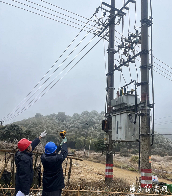 当日上午,该公司双洋供电所一行3人顶着刺骨寒风对穿越竹林的10千伏坑源支线廊道进行特巡,及时清理通道两侧风偏距离不够的竹子,避免竹子因霜冻负重压线导致线路断线,同时加强线路杆基、导线、金具、拉线、瓷瓶、避雷器的全面排查,仔细观察有无覆冰现象,并详细记录覆冰情况。工作人员还通过红外测温检查设备各连接点是否存在打火、发红发热现象,并详细记录测温时间、环境温度、测试温度、负荷情况等,全面、准确掌握配电设备运行情况,及时发现和消除配网各类安全隐患。
