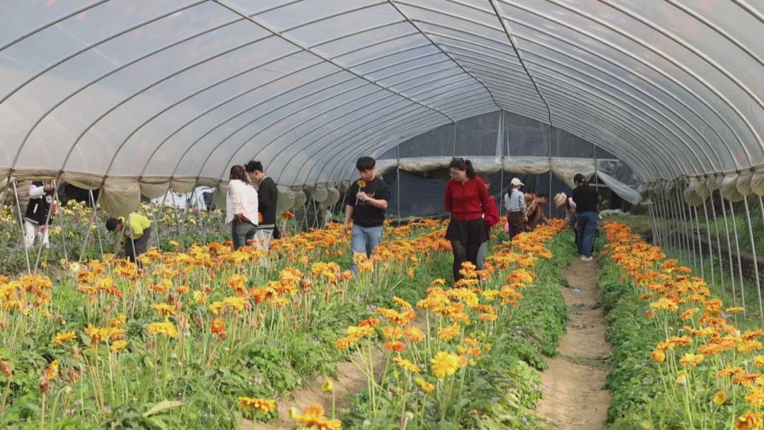 漫步梧地花田间,金灿灿的油菜花铺展成海,蜂飞蝶舞,花香四溢,游客们徜徉在花海之中,拍照打卡、嬉戏游玩,尽享春日田园风光。鲜切花采摘园内,缤纷的花卉娇艳盛放,游客们亲手采摘鲜花,沉浸式感受农耕乐趣,欢声笑语萦绕在花田之上。