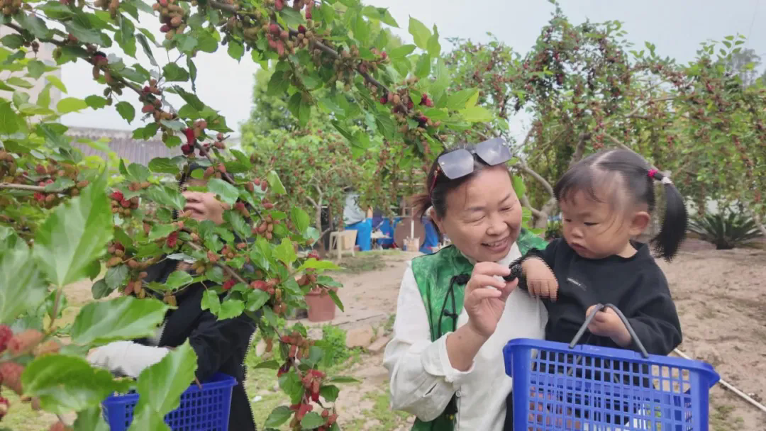 游客 张列苹:这边空气挺好,然后桑葚又熟了。周末带孩子来玩耍,然后又可以采摘桑葚。你看,我家外孙女吃了好几个,很甜。