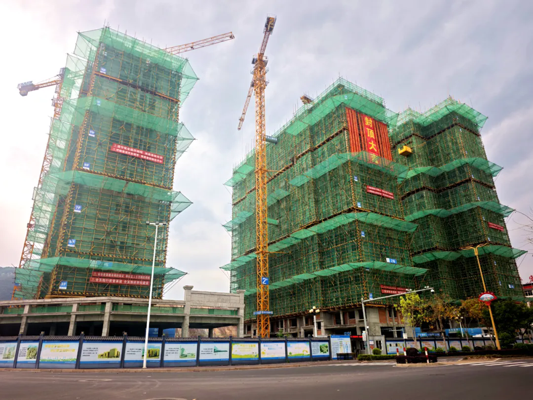 记者在施工现场看到,三栋在建住宅楼主体均被绿色安全防护网紧密包裹,塔吊高耸、机器轰鸣,一派热火朝天的施工景象。2号楼顶层作业面上,工人们正全力推进最后的水泥浇筑工作,目前浇筑已进入收尾阶段,顺利完成后即实现主体全面封顶。